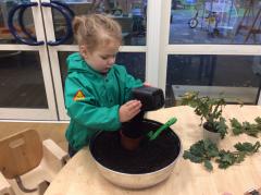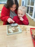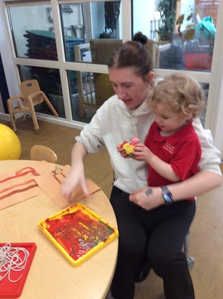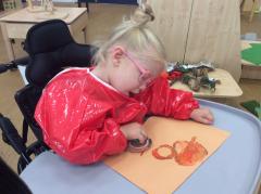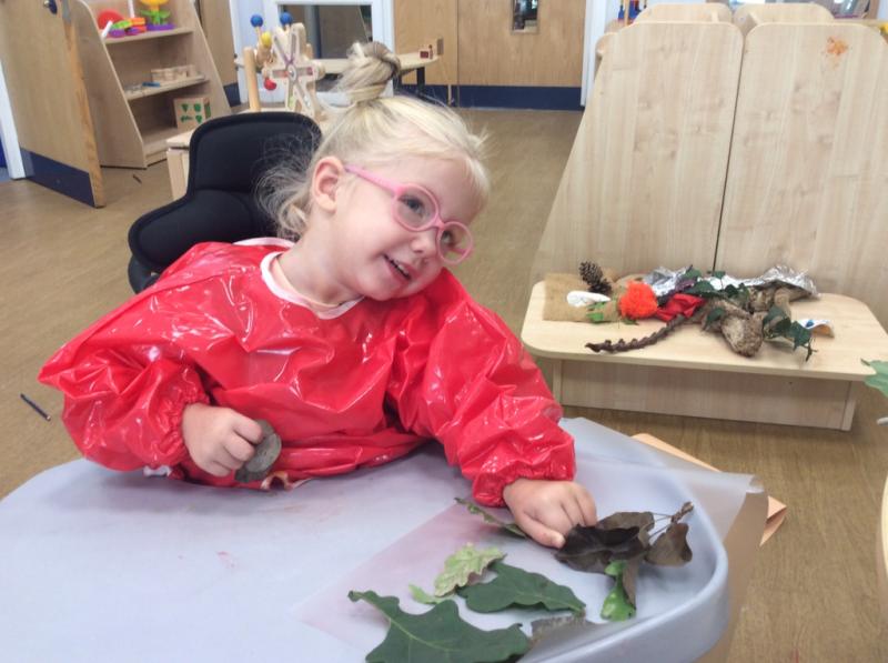 The childen have spent time in the forest obseving signs of Autumn, exploring leaves, creating leaf pictures and also engaging in leaf printing activities. They also investigated a variety of materials and items that we might find during the autumn months such as conkers, seeds and autumn plants. Staff also supported children to create bird feeders to hang in the nursery garden and forest school.