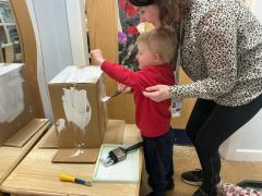 The children have been offered a range of motivating, winter-themed activities to engage in and explore: ice painting, ice shapes with creatures frozen inside them, creating winter collages using winter colours and silver foil, artificial snow and icing sugar and ice scrapers.